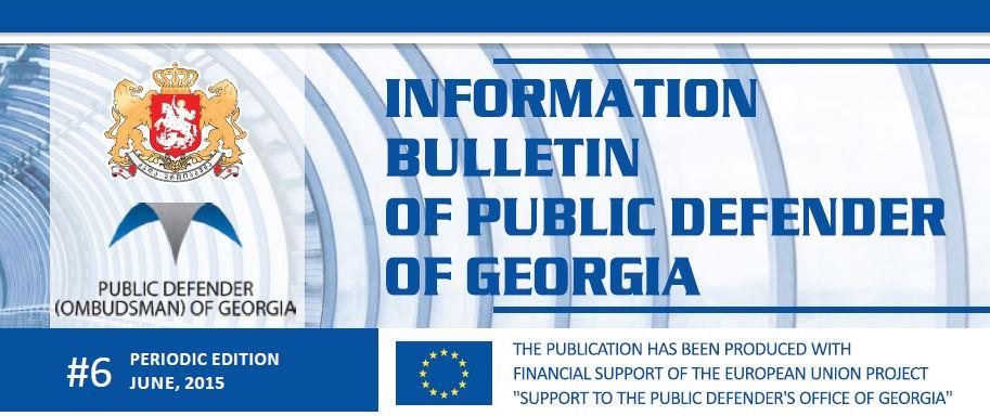 The bulletin reviews the Public Defender’s Parliamentary Report 2014 presented to the diplomatic corps, representatives of state agencies and NGOs in June, as well as special reports on the rights of conflict affected individuals and IDPs, persons with disabilities, gender equality, monitoring of women’s penitentiary institution No5 and shelters of victims of domestic violence, the National Preventive Mechanism (NPM ) and the first edition of NPM quarterly newsletter.