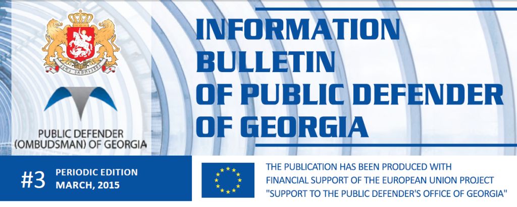 The bulletin also provides information on special reports, various activities and meetings; you will learn about results of the visit of the Public Defender to Geneva. The March issue also presents a report published by the European Commission and High Representative of the European Union for Foreign Affairs and Security Policy on Implementation of the European Neighborhood Policy in Georgia in 2014 and recommendations for actions developed for improvement of human rights situation.