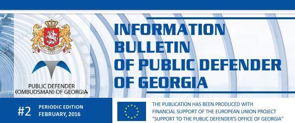 On March 7, 2016, the Public Defender held a press conference, where he traditionally presented the February information bulletin. The bulletin provides a brief overview of the activities of the Public Defender and his Office, including the recommendations prepared after studying certain cases and sent to relevant agencies, Public Defender’s public statements on the high profile events, meetings, monitoring results of closed institutions, training and seminars in civic education. You will also learn about the results of the Public Defender’s recommendations, appeals and public statements.