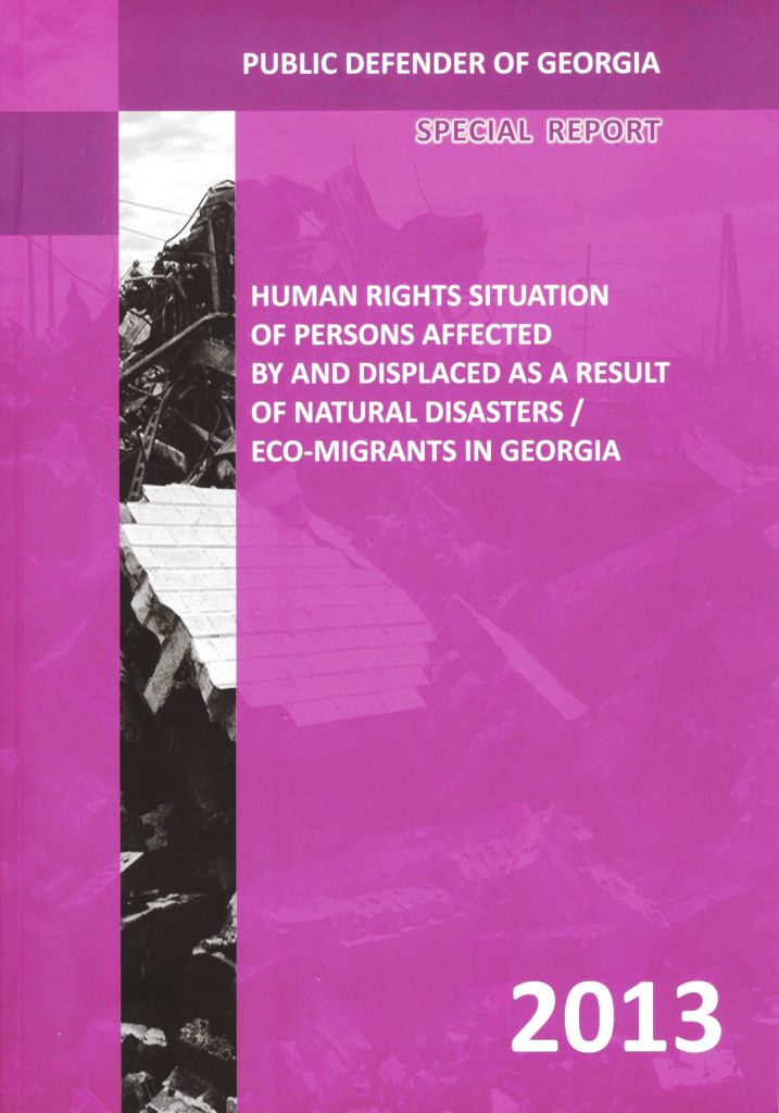 In 2011-2012, The Public Defender of Georgia was frequently addressed by eco-migrants – persons affected by natural disasters and, as a result, forcibly displaced. The examination of applications revealed a wide range of problematic issues which are specifically attended to in this report. The practical work of the Public Defender of Georgia shows that the violations of human rights in this sphere are, as a rule, of a systematic rather than individual and one-off character. Generally, individual violations, too, should be seen as stemming from non-existence of relevant standards of protection. Up until now, the state lacks a relevant legal framework that would govern the legal status of persons affected by natural disasters; neither are there any appropriate guidelines or procedural acts of statutory force that would enable to address the processes ongoing in this sphere in a systematic and structured manner. The observable inconsistent approach and lack of financial resources further exacerbate and add to the existing problems.