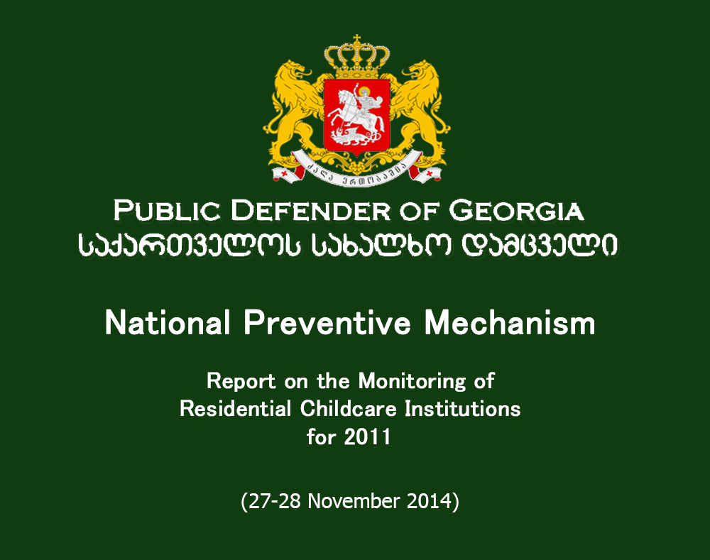 The present Report covers the findings of the monitoring of residential childcare institutions carriedout by the Special Preventive Group of the Office of Public Defender of Georgia in December 2011,within the National Preventive Mechanism mandate. During the monitoring, the Special PreventiveGroup visited residential childcare institutions under the control of “State Care Agency” of theMinistry of Health and Social Affairs of Georgia (Tskneti orphanage, Kojori orphanage, orphanage“Satnoeba”, orphanage “Momavlis sakhli”, Saguramo orphanage, Telavi orphanage, Kutaisiorphanage, Rustavi orphanage, Tsalenjikha orphanage, Zugdidi orphanage, Aspindza orphanage,Batumi orphanage, Tserovani orphanage) as well as the small family type homes for children (inVardisubani, Dusheti, Godogani, Ozurgeti, Kutaisi, Rustavi, Tbilisi, Khashuri, Batumi, Telavi). In total,the Special Preventive Group visited 13 large residential childcare institutions and 17 small familytype homes.