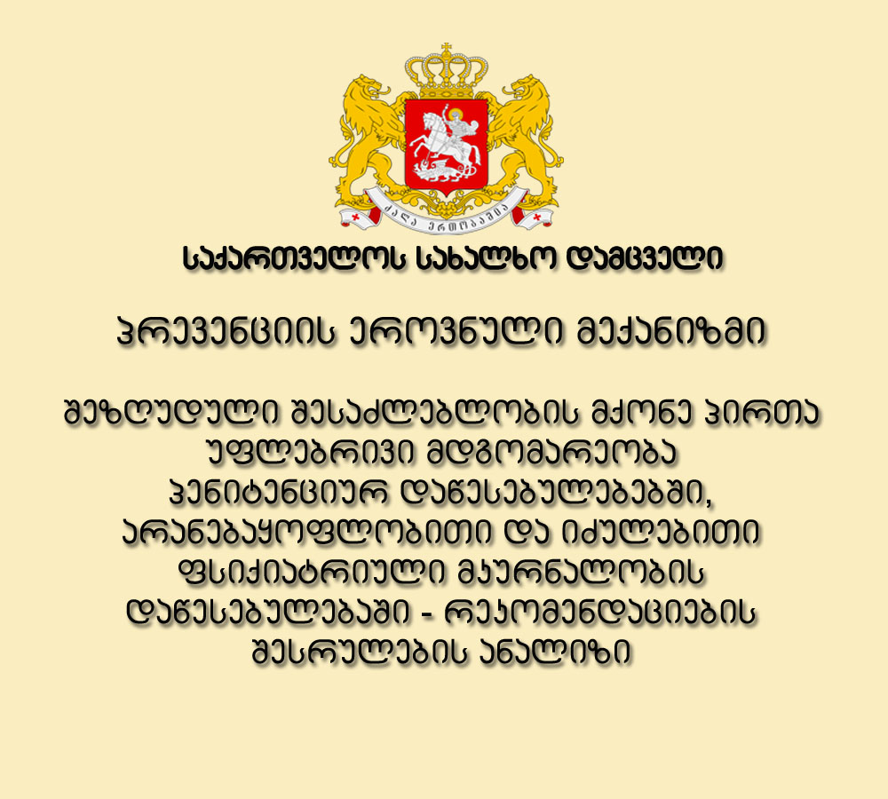 შეზღუდული შესაძლებლობის მქონე პირთა უფლებრივი მდგომარეობა პენიტენციურ დაწესებულებებში, არანებაყოფლობითი და იძულებითი ფსიქიატრიული მკურნალობის დაწესებულებაში - რეკომენდაციების შესრულების ანალიზი