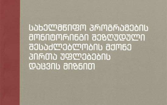 მონიტორინგის ფორმით განხორციელებული მცირემასშტაბიანი კვლევის მიზანს წარმოადგენდა სხვადასხვა სახელმწიფო უწყების მიერ სახელმწიფო პროგრამების განხორციელების პროცესში შეზღუდული შესაძლებლობის მქონე პირთა უფლებების დაცვაზე ზედამხედველობა.