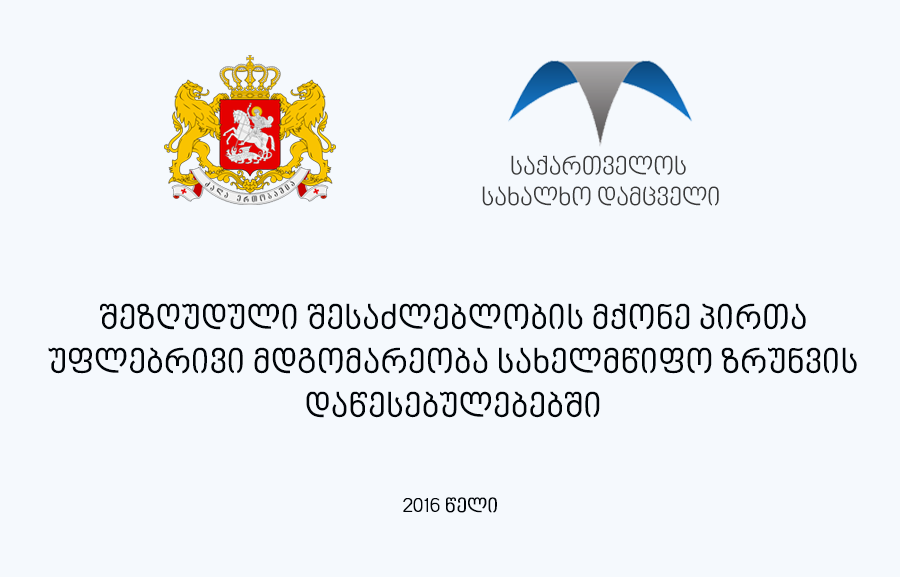 სახალხო დამცველის წარმომადგენლებმა სახელმწიფოს ხუთ რეზიდენტულ დაწესებულებაში: თბილისის ჩვილ ბავშვთა სახლში, კოჯრის შშმ ბავშვთა სახლში, ძევრის, დუშეთისა და მარტყოფის შშმ პირთა პანსიონატებში განთავსებული ბენეფიციარების უფლებათა დაცვის ხარისხი და გაეროს შეზღუდული შესაძლებლობის მქონე პირთა უფლებების კონვენციით, სხვა საერთაშორისო დოკუმენტებით და ეროვნული კანონმდებლობით დადგენილ სტანდარტებთან მისი შესაბამისობა შეამოწმეს.