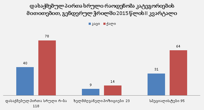 2015 წლის II კვარტალში, საქარველოს სახალხო დამცველის აპარატში დასაქმებული იყო 118 ადამიანი. აქედან, 40 მამაკაცი, ხოლო 78 ქალი. რაც შეეხება ხელმძღვანელ პოზიციებზე დასაქმებულთა რაოდენობას, სულ ხელმძღვანელ პოზიციაზე დასაქმებული იყო 23 ადამიანი – 9 კაცი და 14 ქალი. დასაქმებულ სპეციალისტთა რაოდენობამ კი შეადგინა 95, საიდანაც დასაქმებულ მამაკაცთა რაოდენობაა 31, ხოლო ქალთა –64.