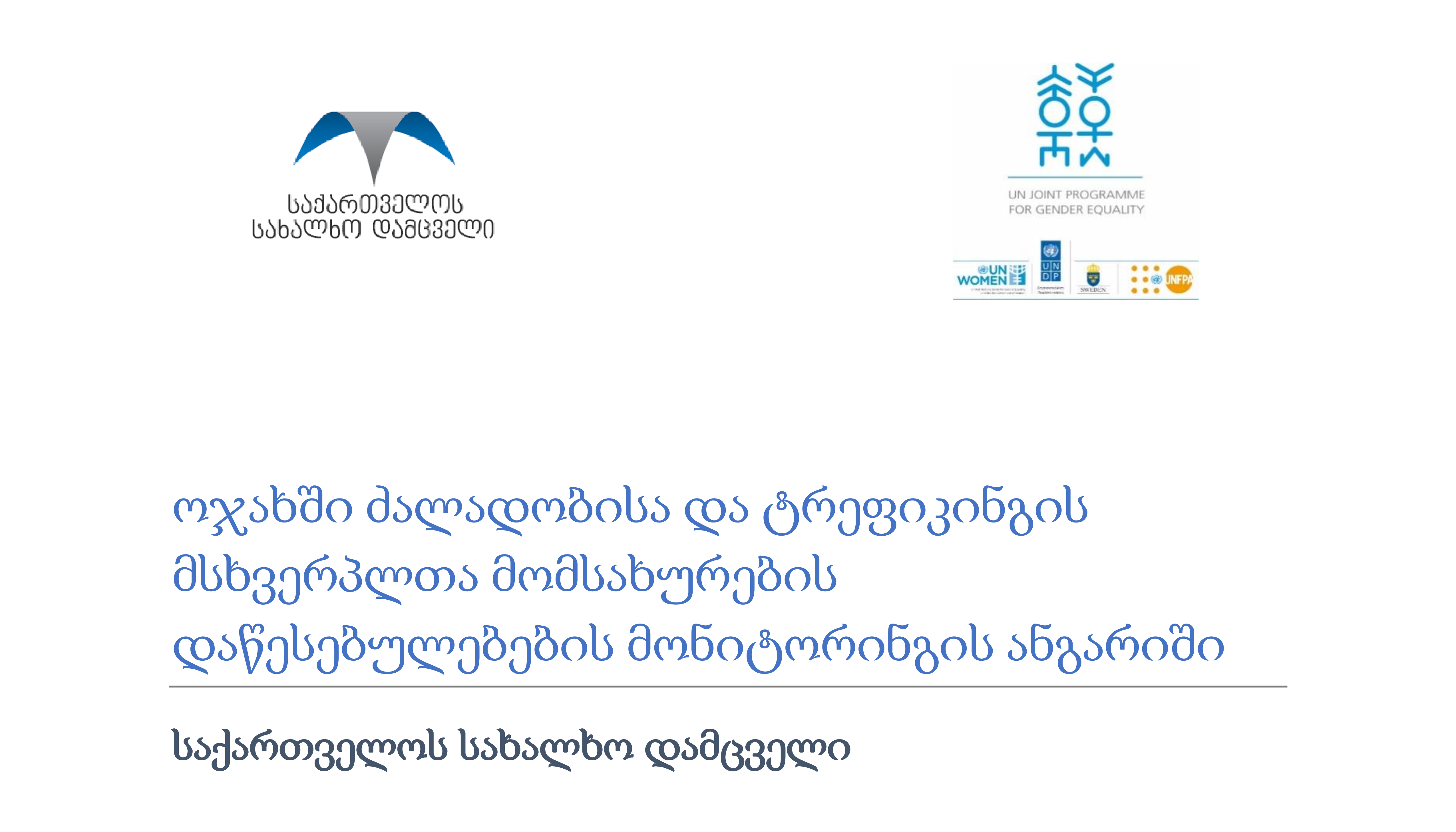 კერძოდ, 2019 წელს საქართველოს სახალხო დამცველის აპარატის გენდერის დეპარტამენტმა, გაეროს ქალთა ორგანიზაციის მხარდაჭერით, ოჯახში ძალადობისა და ტრეფიკინგის მსხვერპლთა თავშესაფრები და კრიზისული ცენტრები შეამოწმეს. მონიტორინგის წევრებმა მოინახულეს ბათუმის, ქუთაისის, გორისა და სიღნაღის თავშესაფრები, ასევე თბილისის, გორის, ქუთაისის, ოზურგეთის და მარნეულის კრიზისული ცენტრები.